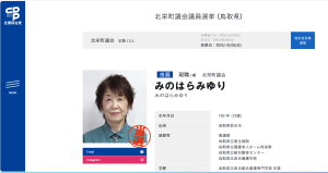 お知らせ 2025年10月1日 【選挙結果】北栄町議会選挙 蓑原美百合氏当選 2期目へ 令和7年9月30日に告示された北栄町議会議員選挙において、無投票となり蓑原美百合(みのはらみゆり)町議の当選が決まりました。 鳥取県連では蓑原美百合町議を推薦しておりました。