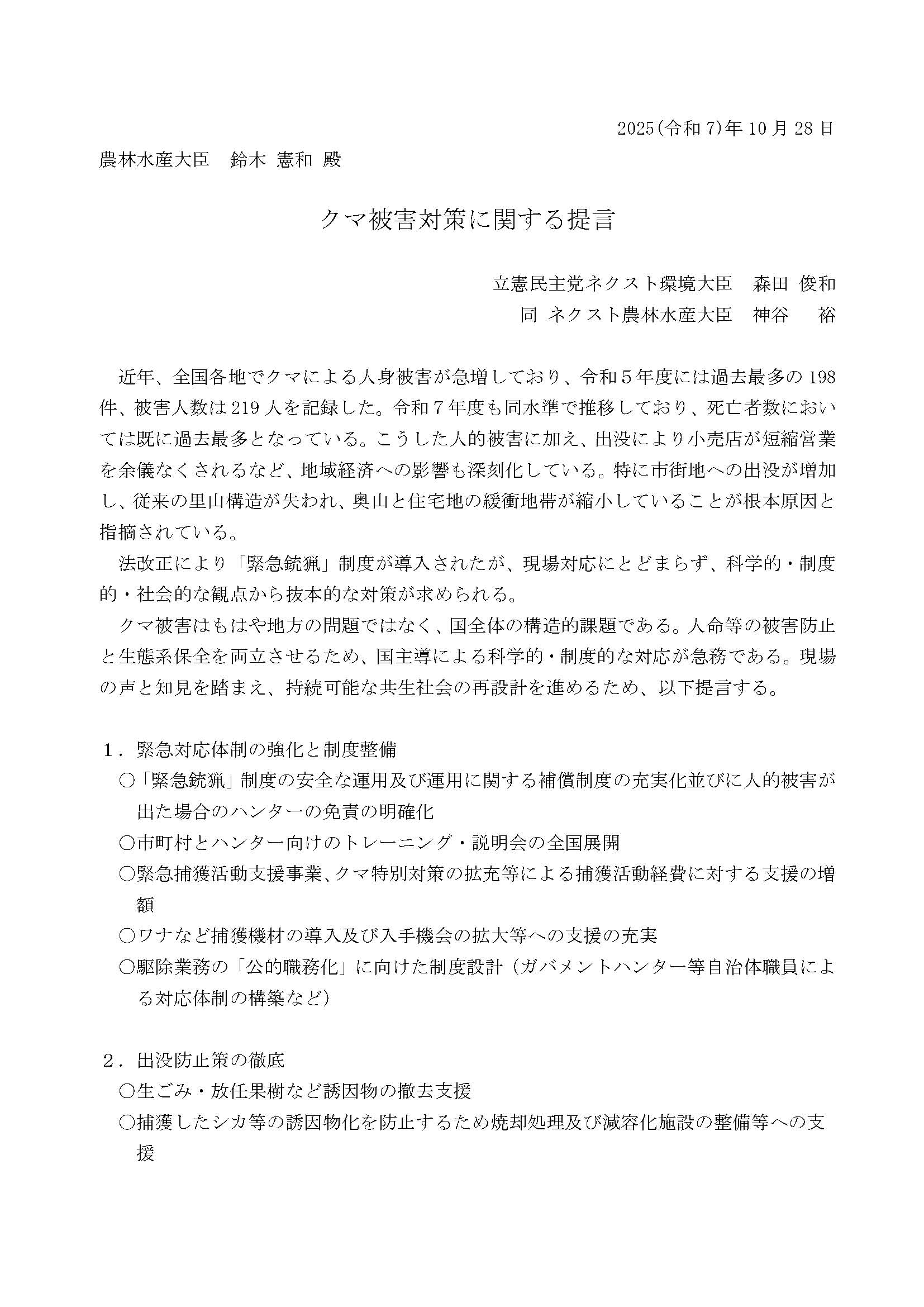 立憲民主党は10月28日、農林水産省を訪れ、クマ被害対策を求める要請を行いました。要請には森田俊和環境部門長、神谷裕農林水産部門長、おおつき紅葉、川原田英世、近藤和也、杉村慎治各衆院議員、徳永エリ、横沢高徳両参院議員が参加しました。農林水産省は、根本幸典副大臣が対応しました。