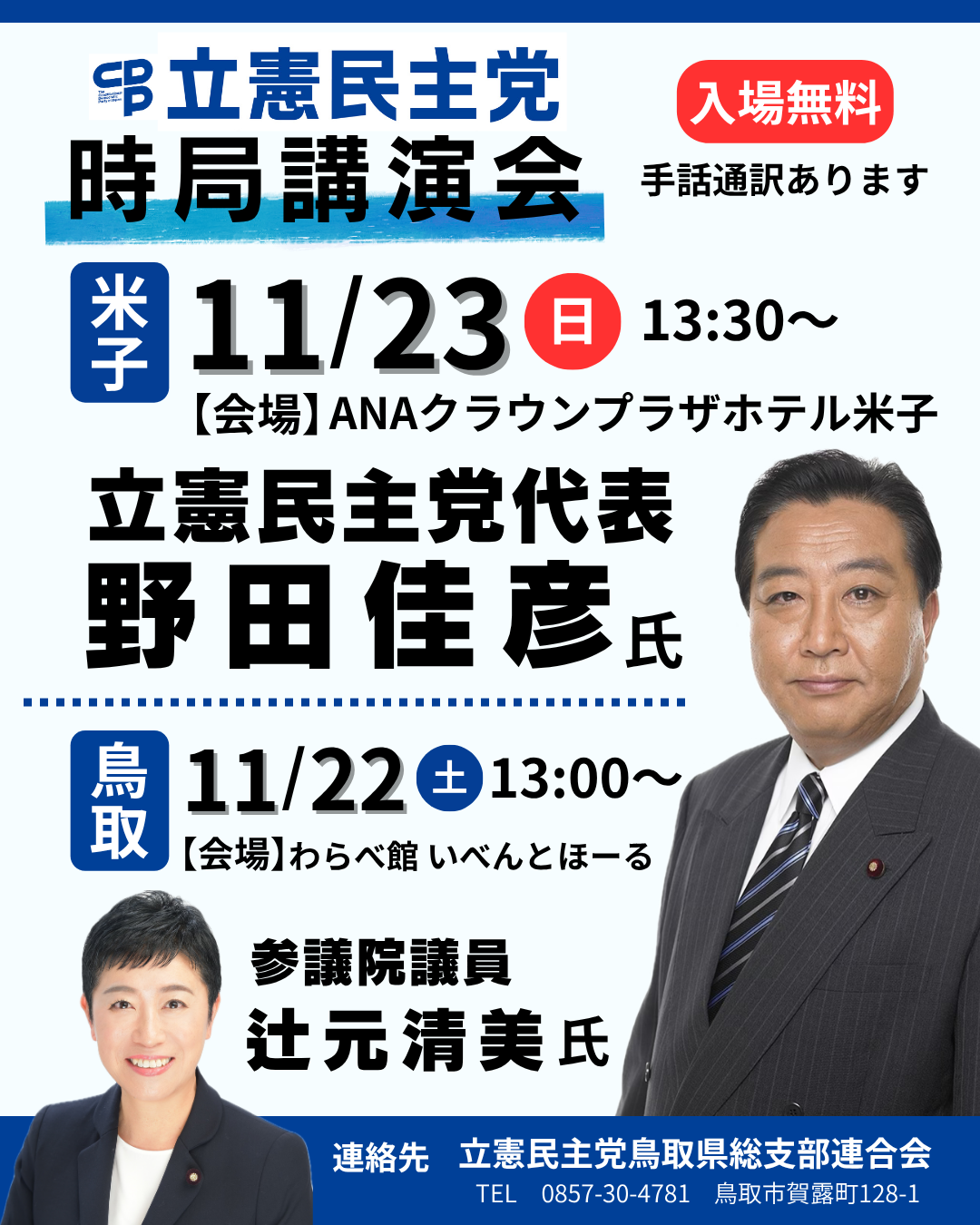 お知らせ 2025年11月17日 野田代表・辻元議員が鳥取に来たる!!立憲民主党時局講演会開催のお知らせ【11/22(土)・11/23(日)】 立憲民主党時局講演会開催のお知らせ 【鳥取】辻元清美 参議院議員が来場 と き/11月22日 (土) 13:00~ ところ/わらべ館いべんとほーる 【米子】野田佳彦 代表が来場 と き/11月23日 (日・祝) 13:30~ ところ/ANAクラウンプラザホテル米子 お問合せは、立憲民主党鳥取県総支部連合会へ(TEL:0857ー30-4781)